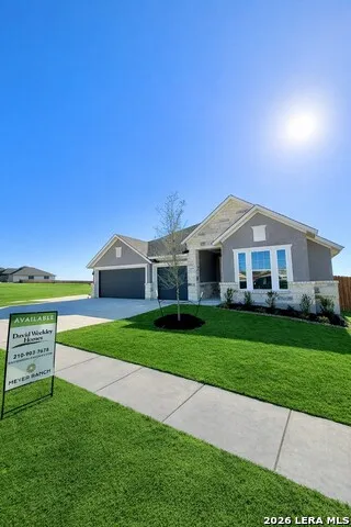 Elevated Hill Country Living on a Corner Cul-de-Sac | Rymer by David Weekley Homes | Meyer Ranch, New Braunfels Located on one of the highest elevation streets in Meyer Ranch, 1308 Spotted Jaguar is a beautifully designed Rymer floor plan set on a nearly quarter-acre corner lot tucked into a quiet cul-de-sac street. From the extended covered back patio, enjoy peaceful Hill Country views that make this homesite truly exceptional. The charming stone and stucco exterior delivers standout curb appeal, while inside, an abundance of natural light fills the open-concept living spaces. The gourmet kitchen is the heart of the home, featuring two-toned cabinetry, a striking center island, quartz countertops, and sleek satin-finished lighting fixtures that add a modern, designer touch. The spacious family room flows effortlessly into the dining and kitchen areas, creating an ideal setting for entertaining or relaxed everyday living. Luxury plank vinyl flooring runs continuously throughout the main living areas and extends into the Owner's Retreat, enhancing both style and durability. The Owner's Suite offers a private sitting area and a spa-like bath complete with a super shower - a true retreat at the end of the day. Bedroom 4 includes its own en-suite bath with a full-size walk-in shower, making it perfect for guests or multi-generational living. With no carpet in the home except the bedrooms, a 3-car garage, and thoughtful design throughout, this home balances comfort, elegance, and function beautifully. Situated in Meyer Ranch, one of New Braunfels' most sought-after master-planned communities, residents enjoy resort-style amenities, scenic trails, Hill Country views, and access to Comal ISD, all just minutes from shopping, dining, and outdoor recreation. If you're searching for a luxury new construction home in New Braunfels, Texas with elevated views, an oversized corner homesite, and designer finishes, 1308 Spotted Jaguar is a rare opportunity. Schedule your private tour today.