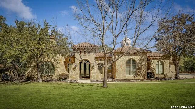 Master Golf Membership available for purchase. Perfectly positioned on 1.07 acres within the highly coveted Clubs Village of Cordillera Ranch, this elegant Hill Country retreat offers exceptional privacy and the convenience of a short golf cart ride to the clubhouse and championship golf course. A pair of striking iron doors opens to a grand entry, where serene courtyard views frame a tranquil koi pond and waterfall-an inviting setting for morning coffee or quiet reflection. The formal living or sitting room is ideally proportioned to accommodate a grand piano, creating a refined space for music-filled evenings conversation, while the dining room provides an elegant backdrop for memorable dinners and celebrations. The heart of the home is a beautifully appointed chef's kitchen featuring custom cabinetry, double ovens, an 8-burner WOLF gas cooktop, double ovens, Sub-Zero refrigeration, and a generous walk-in pantry. A large central island anchors the space, flowing seamlessly into both the breakfast room and family room-ideal for everyday living and effortless entertaining. The grand family room, centered around a warm fireplace, overlooks the covered patio and resort-style pool, creating a welcoming backdrop for gatherings, movie nights, or relaxed evenings at home. The owner's suite is a true sanctuary, showcasing hardwood floors and a spa-inspired bath with soaking tub, walk-in shower, dual vanities, and an expansive custom wardrobe room. Guests are well accommodated with a private main-level suite near the courtyard, while two additional upstairs bedrooms each offer ensuite baths. A dedicated study with built-in desk and shelving provides a quiet, functional work-from-home space. Fabulous views of the Twin Sisters grace the outdoor space providing a year-round oasis with a covered patio, built-in outdoor kitchen, and multiple areas for lounging or dining, all overlooking a sparkling negative-edge pool and spa with outdoor shower. Completing the home is a GENERAC propane generator, an attached three-car garage and abundant storage. Experience refined Hill Country living at its finest in one of Cordillera Ranch's most desirable settings.