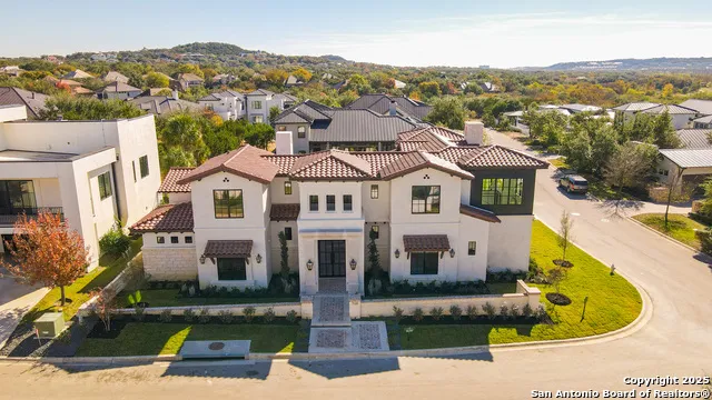 Meticulously designed by award-winning architect Oscar E. Flores and masterfully constructed by Magnolia Custom Homes, this Spanish architectural gem in The Bluffs Dominion is a rare expression of timeless elegance and modern luxury. Rising from a private corner lot, the residence stuns with its unique stucco facade, complemented by natural stone and metal accents. The grand entrance boats a brick-paved walkway and porch, a solid architectural cast-stone entry, 11 foot wrought-iron French doors crowned by Spanish tile roof with exposed rafter tails. The limestone and landscaping complete its commanding exterior presence. Beyond the grand entry, interiors unfold with soaring ceilings, Douglas Fir beams, white oak flooring in herringbone pattern, marble tile accents and smooth plastered walls enriched by alabaster, brass, and glass lighting. A custom bar with floating shelves, bold wall treatments, and coffered ceilings with integrated lighting throughout elevate every space with refinement. The chef's kitchen is a showpiece with reeded white oak cabinetry, a Taj Mahal quartzite island, matching stone backsplash, fluted glass cabinets, plastered vent hood, and a hidden butler's pantry with sink, counter space, and room for an additional refrigerator. Outfitted with professional-grade Thermador appliances- including a WiFi-enabled built in 48-inch refrigerator/ freezer columns, six-burner range with griddle and double gas oven, plus an additional built-in electrical wall oven, microwave, and paneled dishwasher. An apron sink, adorned with antique brass fixtures, frames a picturesque view into the living room, where a stately fire place and exquisite architectural detailing harmoniously tie the living room together. Retreat to the primary suite, a sanctuary of exposed beams, dual custom closets including secondary washer/dryer, a spa-worthy tub and high-design frame-less glass shower and custom floating vanities. Designated for seamless indoor/outdoor entertaining, the oversized sliding doors lead to a beautifully tiled sizable patio with Douglas Fir ceiling and beams, stone-clad BBQ grill, and an elegant exterior half bath. The generous square footage of the private level backyard with stone-tiered garden terraces and extensive landscaping provide and idyllic canvas for a custom swimming pool or resort-style retreat. The luxurious office features classic wall panel moldings, rich moody paint and custom lighting, plus a built-in 'secret' murphy book shelf leading to an substantially sized closet with room for a safe that adds a touch of modern sophistication. The downstairs guest suite indulges in serene views of the front courtyard, complemented by a show-stopping en-suite bathroom adorned with intricate marble mosaic tile, generous walk-in closet, and bespoke nickel fixtures that exude timeless sophistication. The second living upstairs showcase a stunning display of floor to ceiling windows and a Spanish-tiled balcony offers sweeping hilltop views. Two large upstairs bedrooms are accompanied by private walk-in closets and bathrooms, each thoughtfully finished with its own signature mix of marble, tile, and floating vanities- spaces as unique as the rooms they serve. The expansive three-car garage boats soaring ceilings, a built-in work bench and custom cabinetry, an additional storage closet, plus two electric car enabled charging outlets in total to offer maximum functionality and potential. Smart home features, Sonos sound systems, CAT-6 wiring, three HVAC units, and tankless water heaters ensure modern convenience throughout this brand new construction residence. With every detail curated to embody the romance of Spanish architecture combined with sophistication of contemporary luxury, this estate is a crown jewel within the gates of the Dominion.